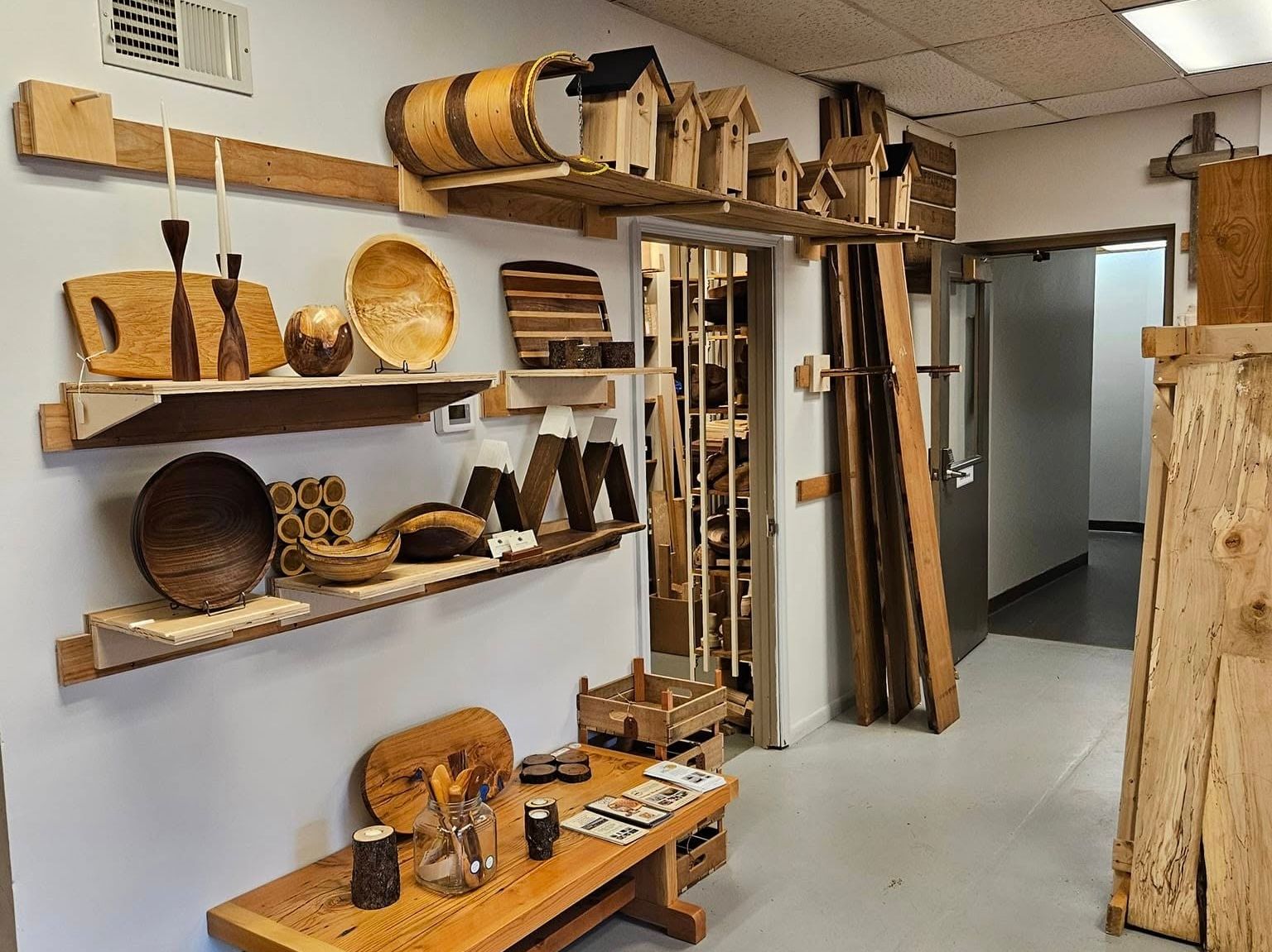 Discounts at the shop: 20% off woodturning stock, 10% off flat woodworking stock, and 10% off finished gallery pieces like bowls, cutting boards, charcuterie boards, and vases.