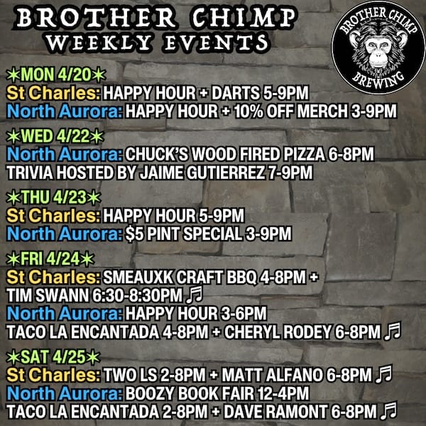 This section is brought to you by Brother Chimp Brewing — your welcoming, neighborhood taproom with convenient locations in St. Charles and North Aurora. See all of their upcoming events.