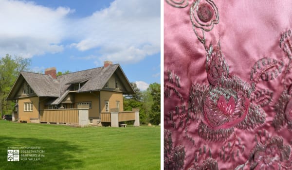 The Fabyan Villa Museum (left) and Nelle Fabyan’s Parisian Couture Gown designed by Georges Doeuillet (right) 📸 Credit: Preservation Partners of the Fox Valley
