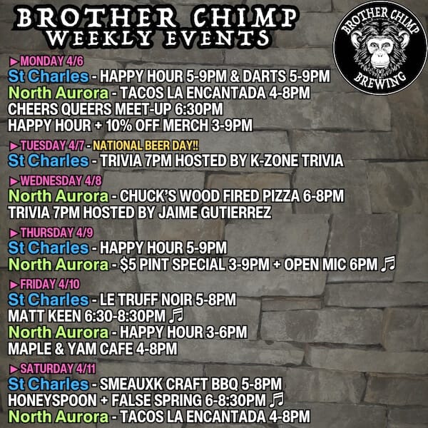 This section is brought to you by Brother Chimp Brewing — your welcoming, neighborhood taproom with convenient locations in St. Charles and North Aurora. See all of their upcoming events.